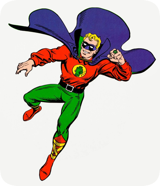 The earliest Green Lantern costume debuted with the Golden Age version of the character, Alan Scott, in 1940. His design featured a red tunic, green cape, and a lantern emblem that predated the later Corps-style uniforms. This early costume reflected the mystical origin of the character before the science-fiction reinterpretation introduced in the Silver Age. Sources: (DC Comics Archives, Library of Congress, Grand Comics Database)