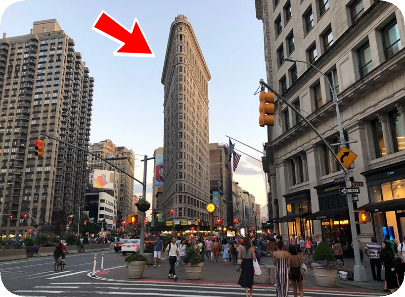 The Flatiron Building, originally called the Fuller Building, is the 22-story steel-framed triangular skyscraper completed in 1902 at the intersection of Fifth Avenue, Broadway, and 23rd Street in New York City. Designed by Chicago architect Daniel Burnham, its distinctive wedge shape forced by the narrow lot created strong wind gusts that once lifted women's skirts, prompting police to chase away onlookers with the phrase "23 skidoo." The building was designated a New York City landmark in 1966 and, after years of vacancy, was converted to luxury residential condominiums with retail space in 2024. Sources: (New York City Landmarks Preservation Commission, NYC Department of Buildings, Greenwich Village Society for Historic Preservation)