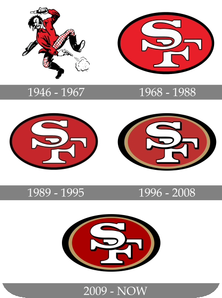 The original San Francisco 49ers logo, introduced when the team was founded in 1946, featured a cartoon-style gold miner inspired by the California Gold Rush of 1849. The miner was shown mid-jump, wearing plaid pants and a red shirt, with his hat flying off while firing two pistols in opposite directions. This imagery directly referenced the prospectors known as Forty-Niners and symbolized the adventurous spirit associated with the team's name. The character logo was used through the early 1960s before the franchise transitioned to the simpler interlocking "SF" oval design. Sources: (San Francisco 49ers Official Team History, Pro Football Hall of Fame, NFL Official Media Guide)