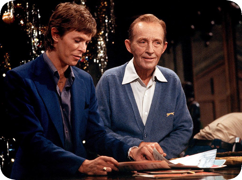 The image captures David Bowie and Bing Crosby performing the televised duet "Peace On Earth / Little Drummer Boy," which aired on Bing Crosby's Christmas special in 1977. The performance paired Crosby's traditional baritone with Bowie's contemporary style, creating an unexpected cross-generational moment in holiday television history. Bowie wrote the counter-melody "Peace On Earth" specifically for the broadcast after declining to sing the original song alone. The duet has since become one of the most replayed and recognized Christmas performances in television history. Sources: (CBS Television Archives, BBC Music, Library of Congress Recorded Sound Archive)