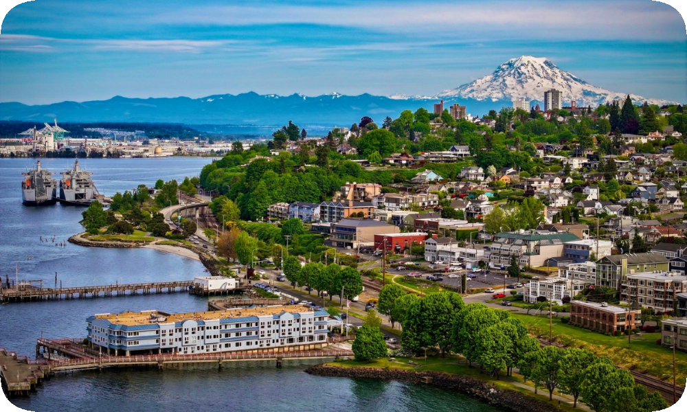 Tacoma, Washington's skyline view is closely tied to its waterfront along Commencement Bay, where Puget Sound forms a defining foreground for the city. On clear days, Mount Rainier rises prominently in the background, creating a dramatic contrast between the urban shoreline and the natural landscape. This combination of deep-water port activity, downtown structures, and the distant volcanic peak reflects Tacoma's geographic identity as a port city shaped by both commerce and scenery. The view highlights Tacoma's location within the South Puget Sound region and its long-standing connection to maritime trade and the surrounding mountains. Sources: (City of Tacoma Official Website, Port of Tacoma, National Park Service)